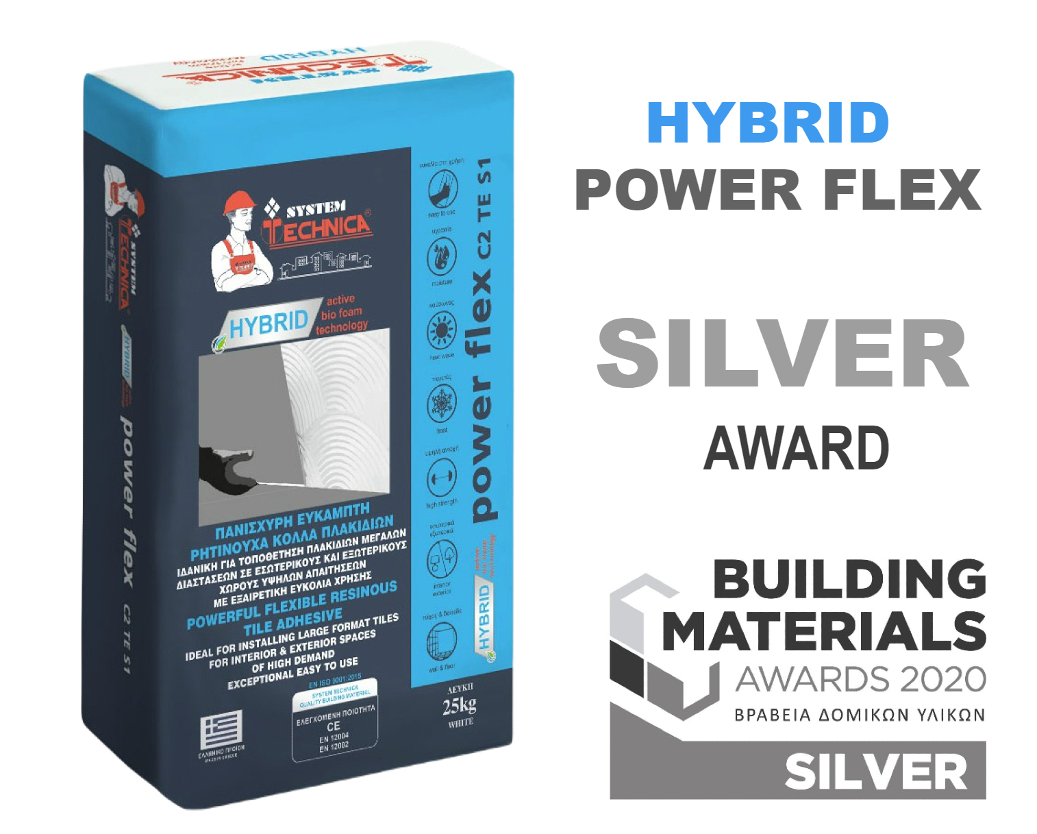 HYBRID POWER FLEX (WITH ACTIVE BIO FOAM TECHNOLOGY) HIGH PERFORMANCE TILE ADHESIVE IDEAL FOR THE INSTALLATION OF EXTRA LARGE TILES. EXCEPTIONAL EASE OF USE IN ALL APPLICATION CONDITIONS. CLASSIFICATION: C2TE S1