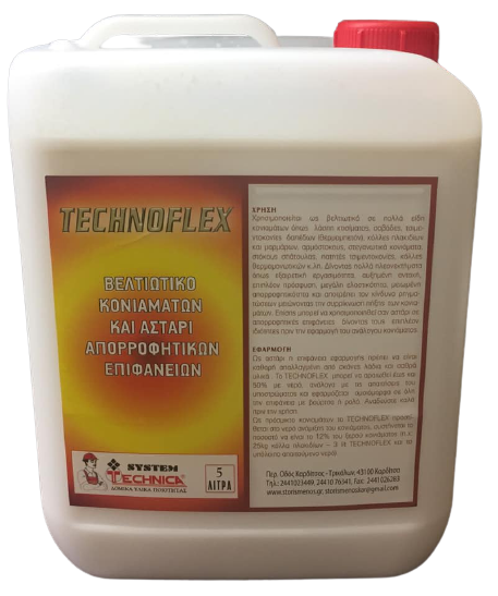 Ως αστάρι η επιφάνεια εφαρμογής πρέπει να είναι καθαρή απαλλαγμένη από σκόνες λάδια και σαθρά υλικά. Το TECHNOFLEX μπορεί να αραιωθεί έως και 50% με νερό, ανάλογα με τις απαιτήσεις του υποστρώματος και εφαρμόζεται ομοιόμορφα σε όλη την επιφάνεια με βούρτσα ή ρολό και η κατανάλωση του είναι από 100-200ml/m² ανάλογα με την απορροφητικότητα της επιφάνειας. Αναδεύστε καλά πριν την χρήση. Ως πρόσμικτο κονιαμάτων το TECHNOFLEX προστίθεται στο νερό ανάμιξης του κονιάματος, συστήνεται το ποσοστό να είναι 12% του ξερού κονιάματος (π.χ: 25 kg κόλλα πλακιδίων – 3 lit TECHNOFLEX και το υπόλοιπο απαιτούμενο νερό).
